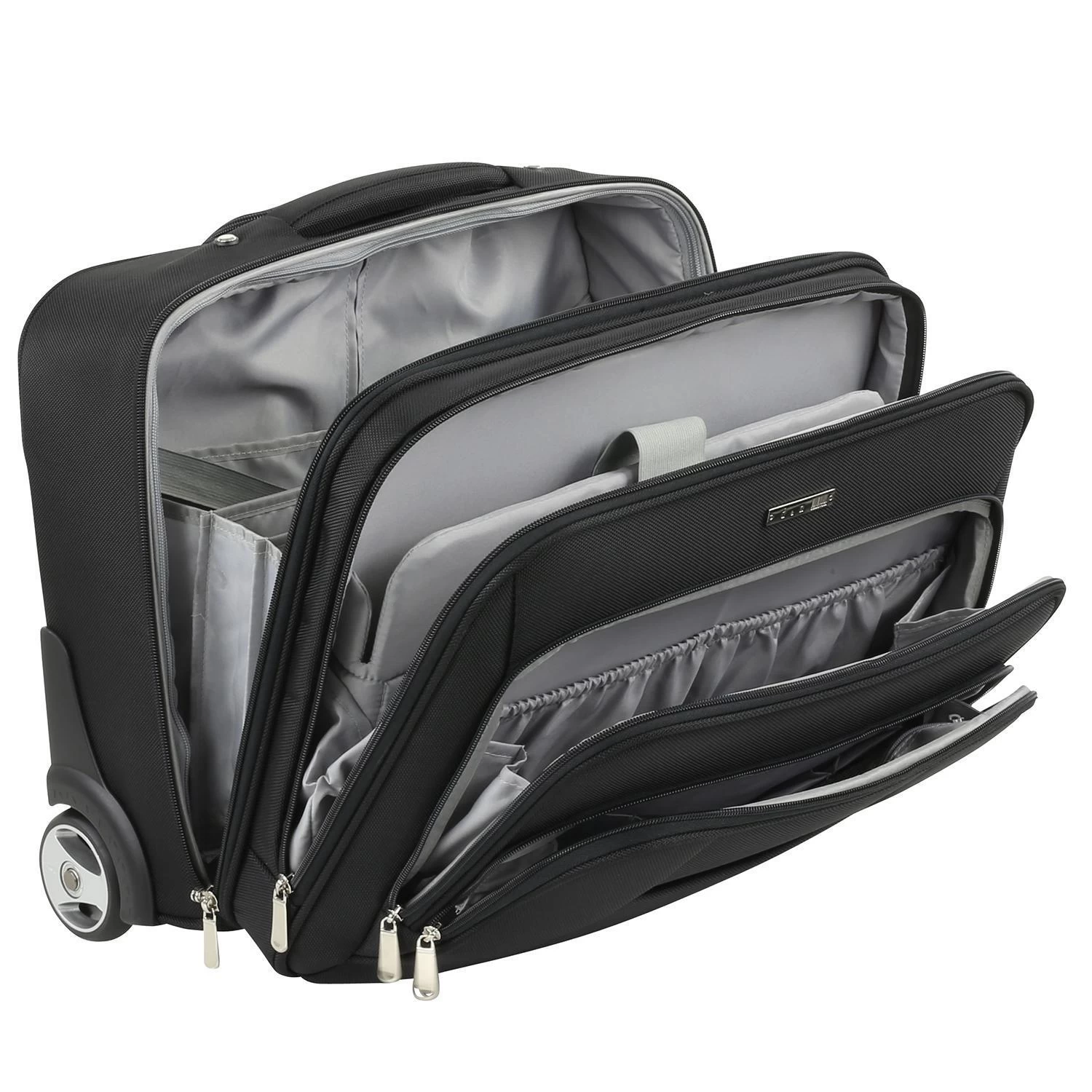 - Fronttasche mit Organizer (Handyfach und 2 Stifte, 2 Steckfächer, Schlüsselband und Netztasche mit RV)