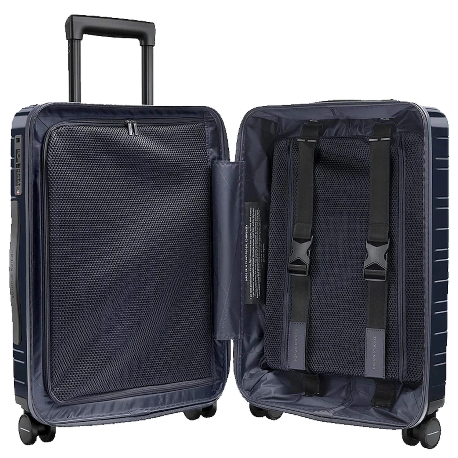 Dieses Gepäckstück verfügt über eine Hartschale aus Premium-Polycarbonat, wobei ein Teil davon recycelt wurde. Das Innenfutter besteht aus recyceltem Polyester. Bei der Produktion werden ausschließlich vegane Materialien verwendet. Die Kofferproduktion ist zu 99 Prozent abfallfrei.