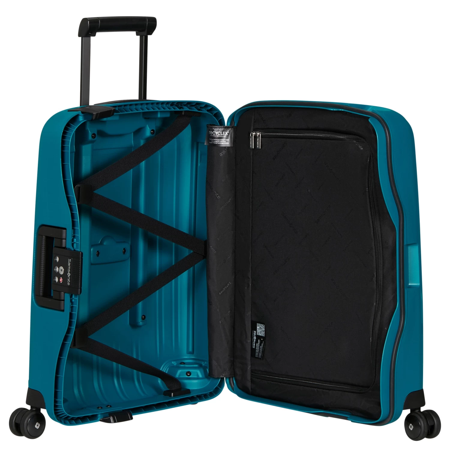 - die Innenausstattung für leichtes und gut organisiertes Packen umfasst niedrig positionierte Kreuzspanngurte in der Bodenschale und einen Raumteiler mit RV in der oberen Schale