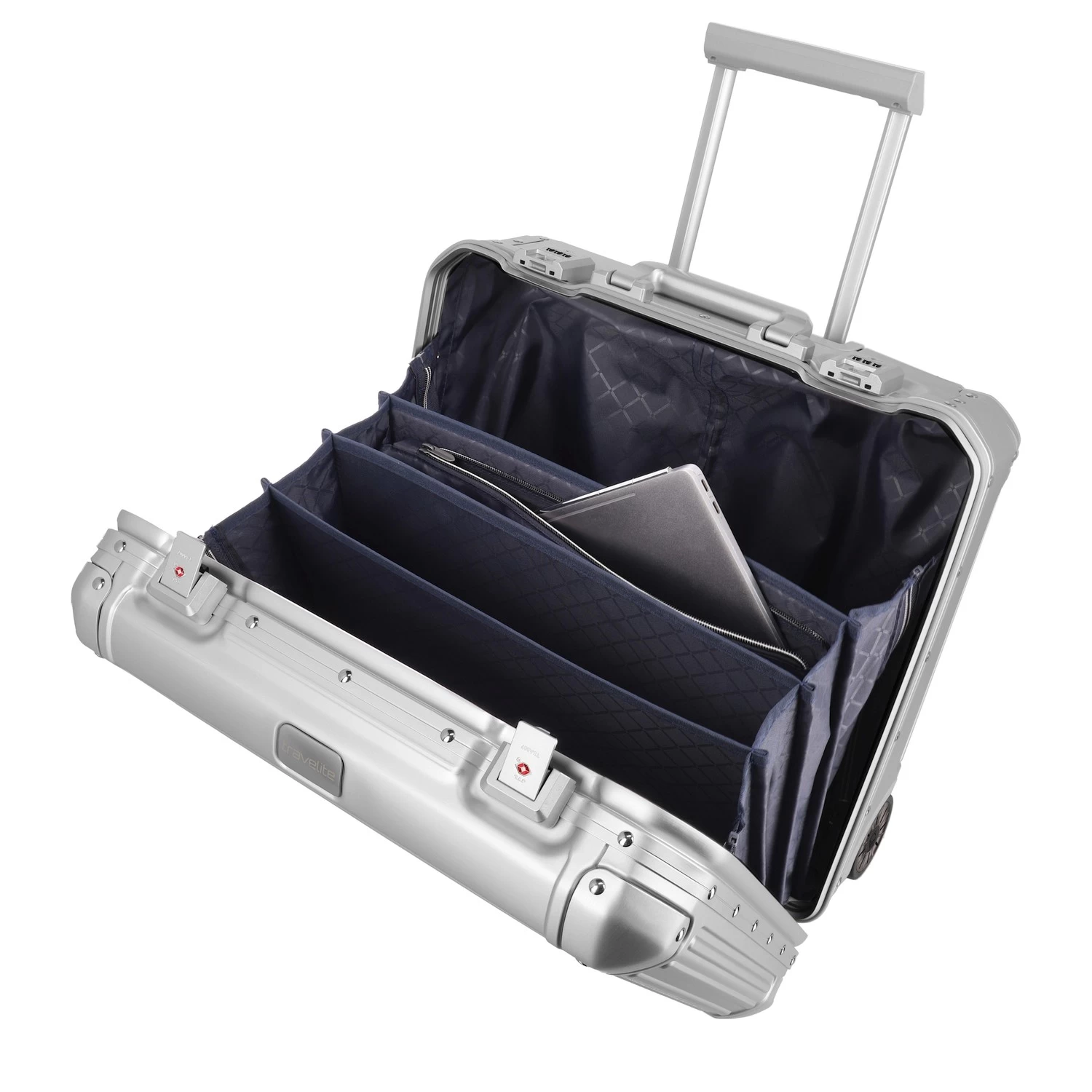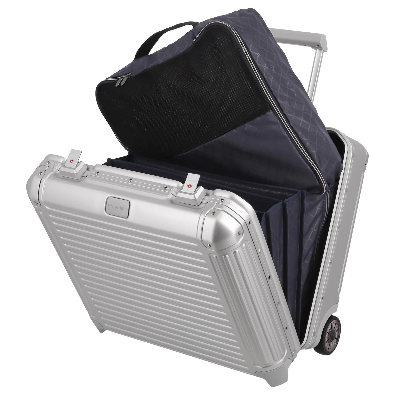 Praktisch, wenn man den Koffer von oben öffnen kann: der Businesswheeler Next im Stil eines Pilotenkoffers glänzt mit einer durchdachten Inneneinteilung. Dank mehrerer, getrennter Fächer und eines Reißverschlussfachs finden Dokumente und Unterlagen in DIN A4-Größe ihren Platz. Außerdem gibt es ein gepolstertes Notebook- oder Tabletfach sowie einen herausnehmbaren Wäschebeutel – für jederzeit perfekte Ordnung.